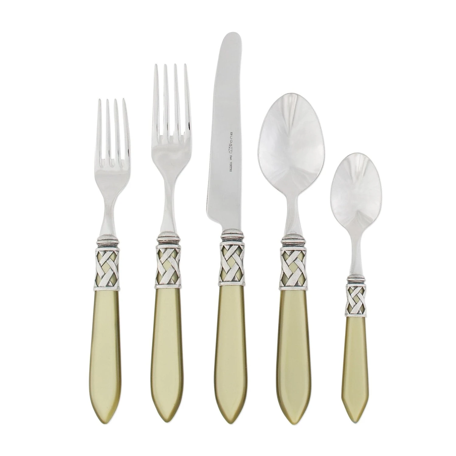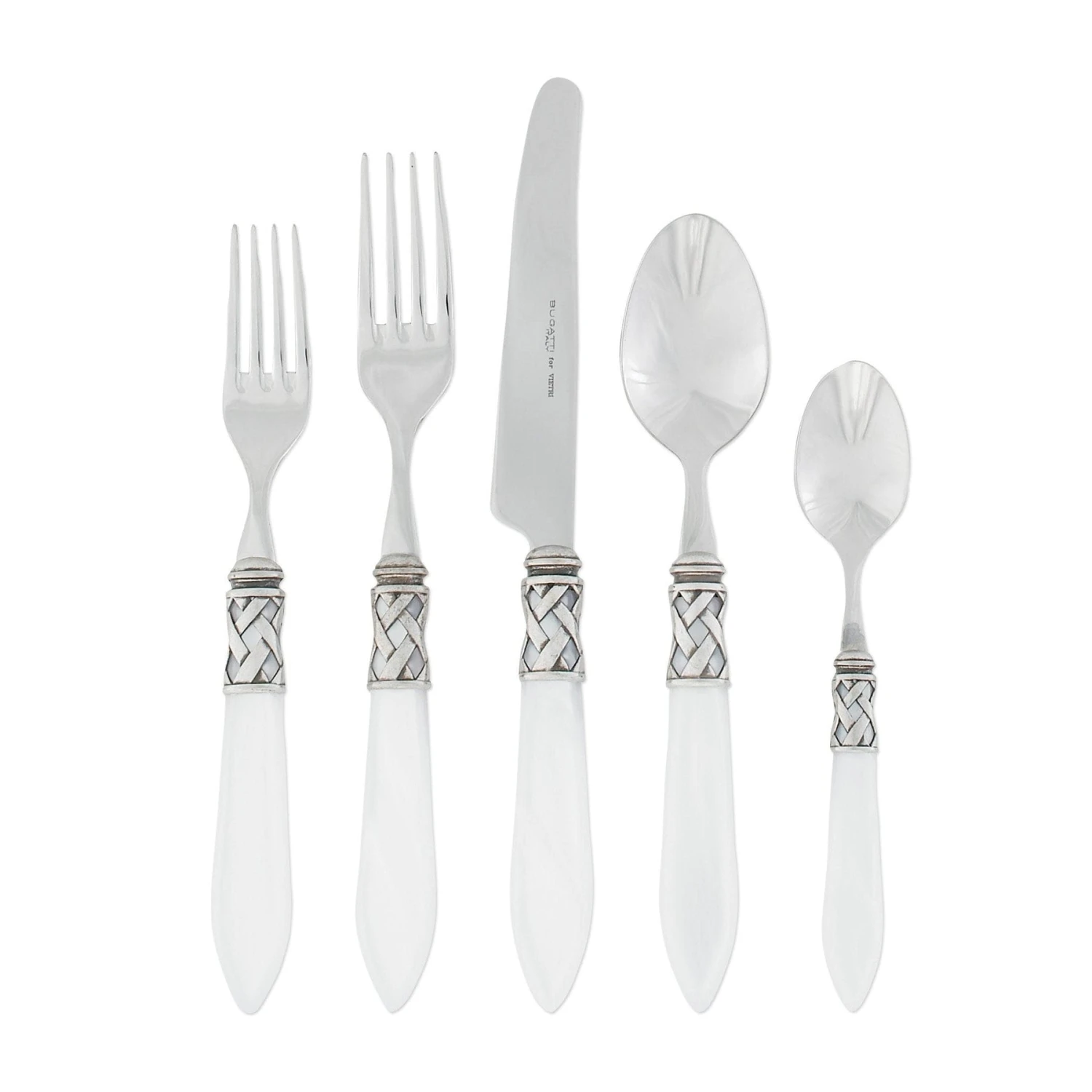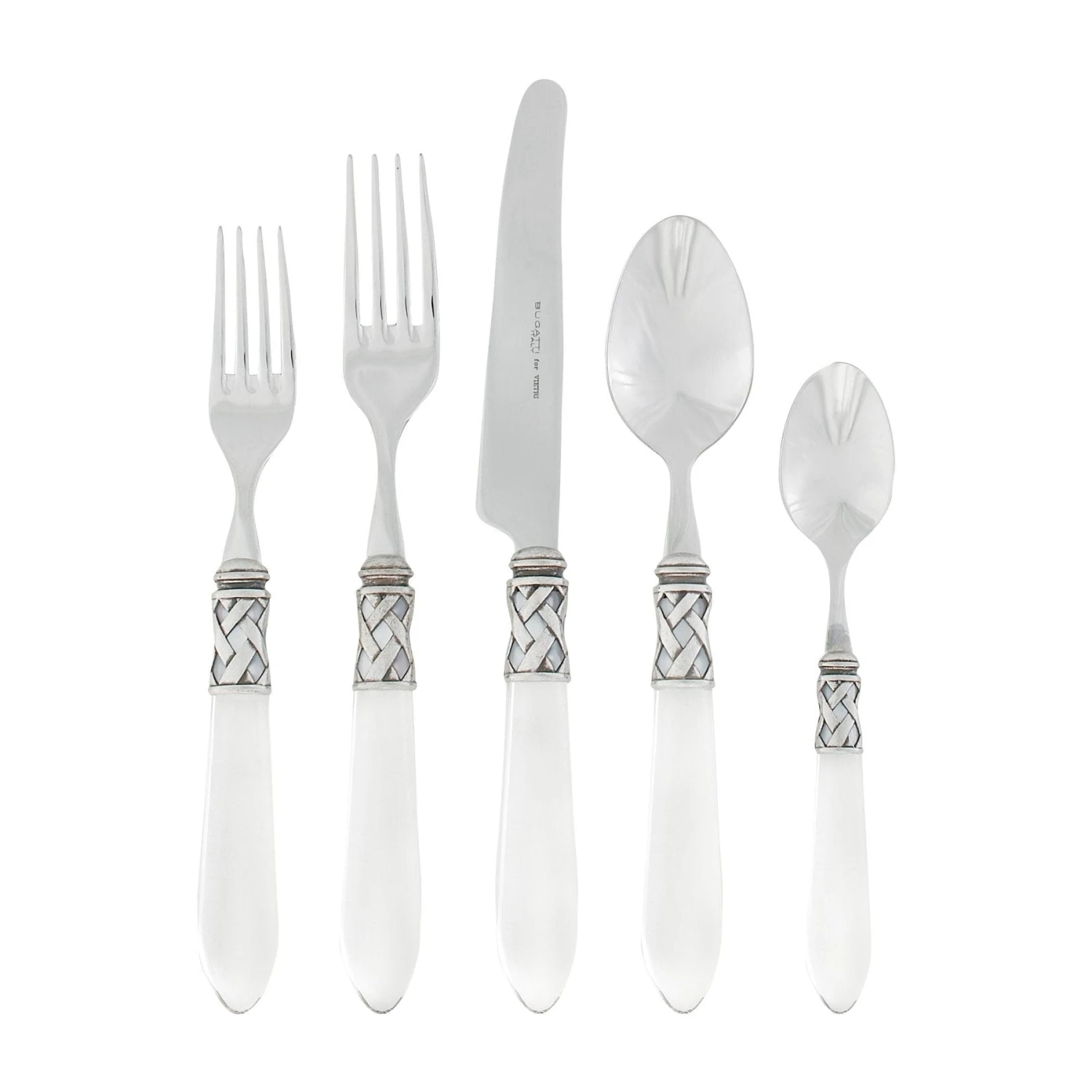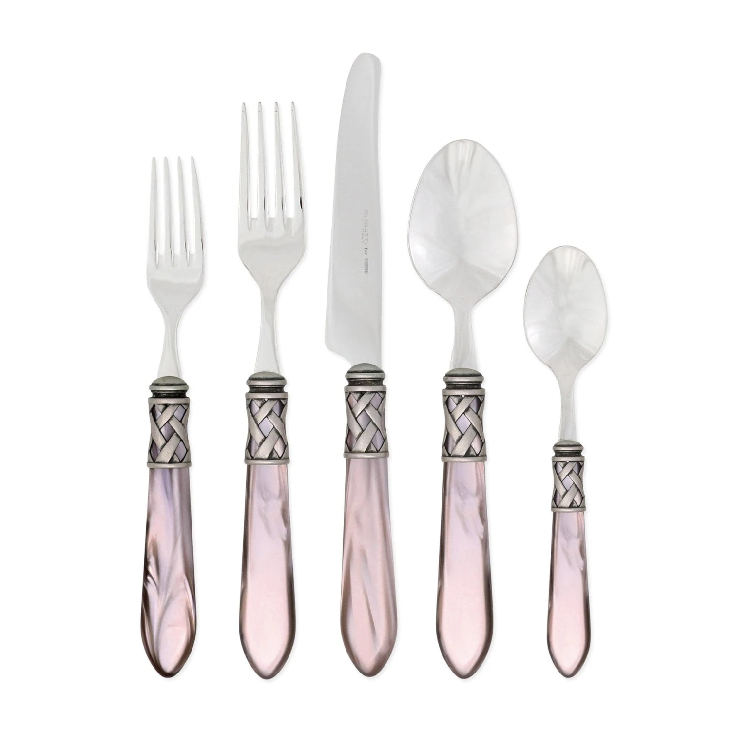 The Aladdin Antique Five-Piece Place Setting features elegant pearlized handles with the strength of high-grade acrylic and 18/10 stainless steel. The handles are wrapped with intricate lattice metalwork.