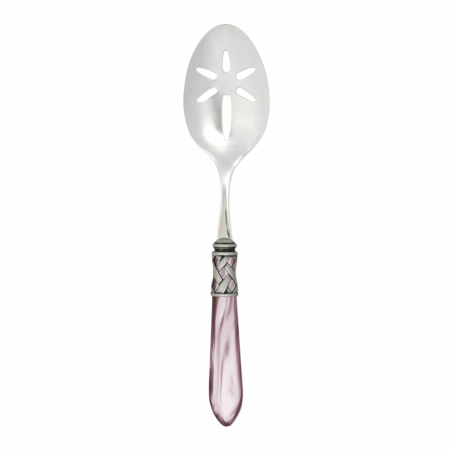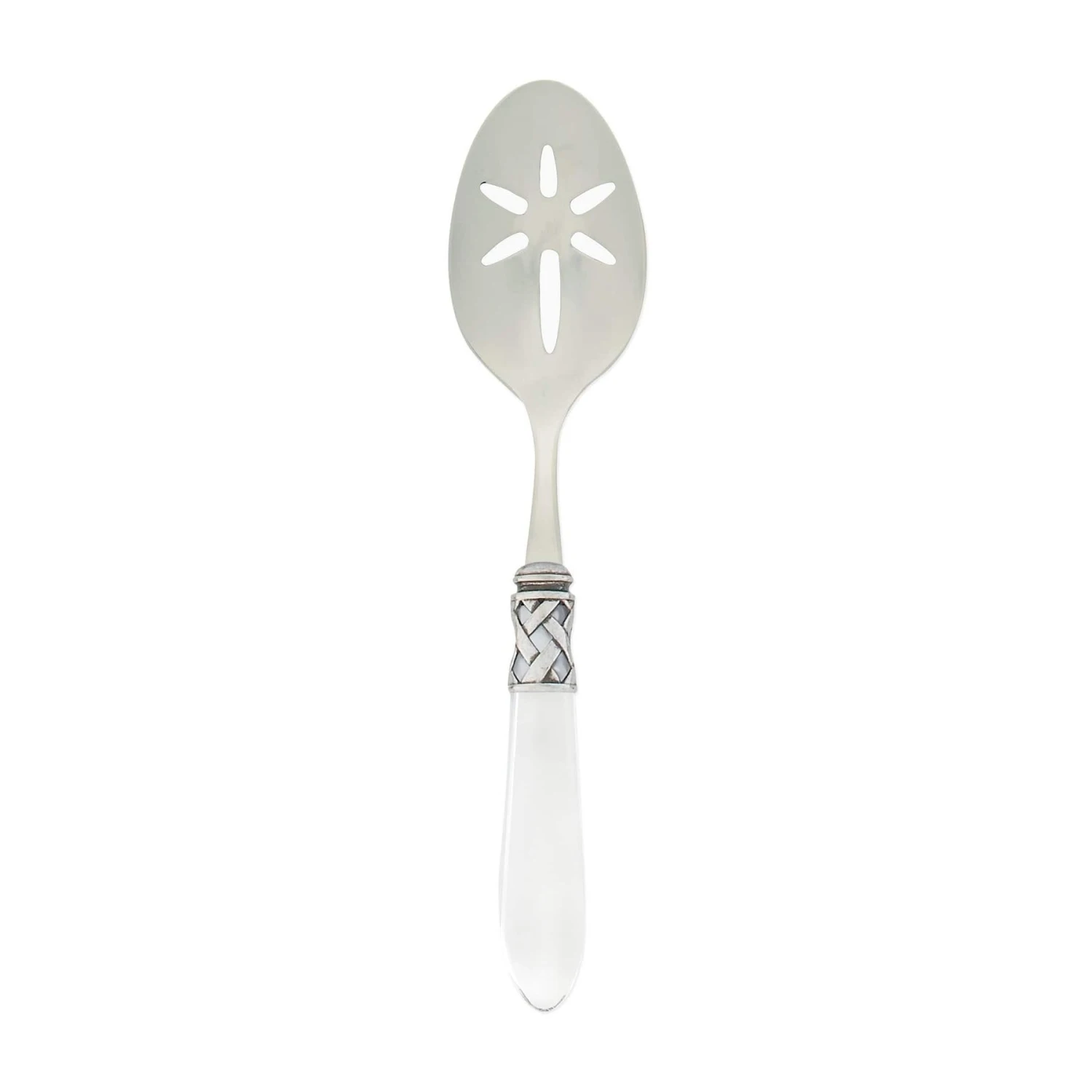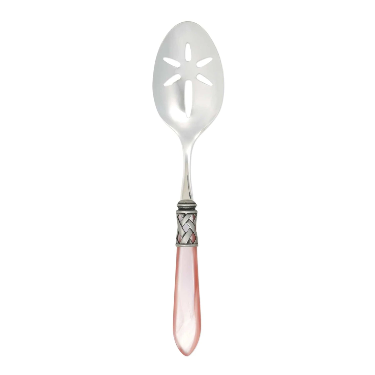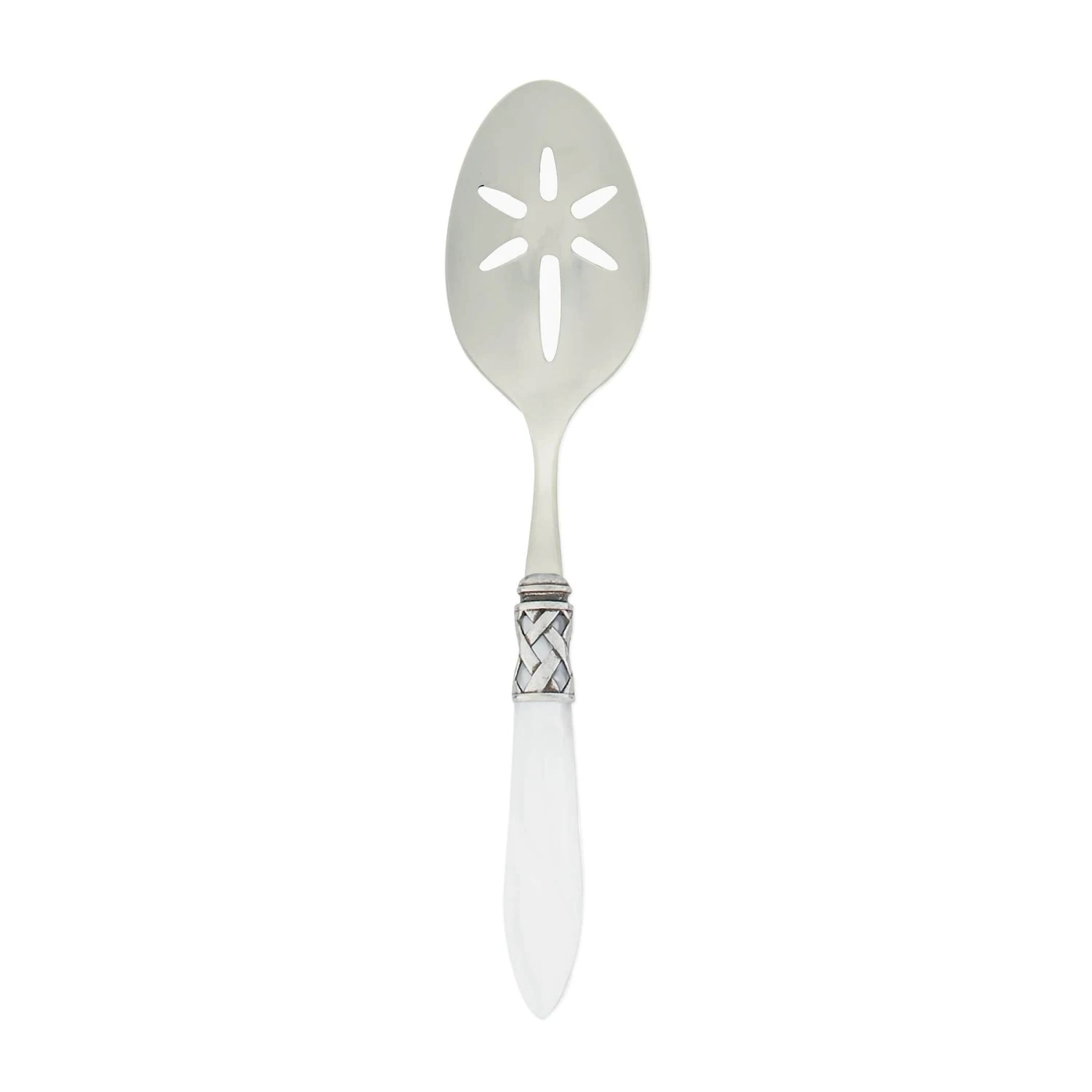 The Aladdin Antique Slotted Serving Spoon features elegant pearlized handles with the strength of high-grade acrylic and 18/10 stainless steel. This piece is also available in our brilliant finish.