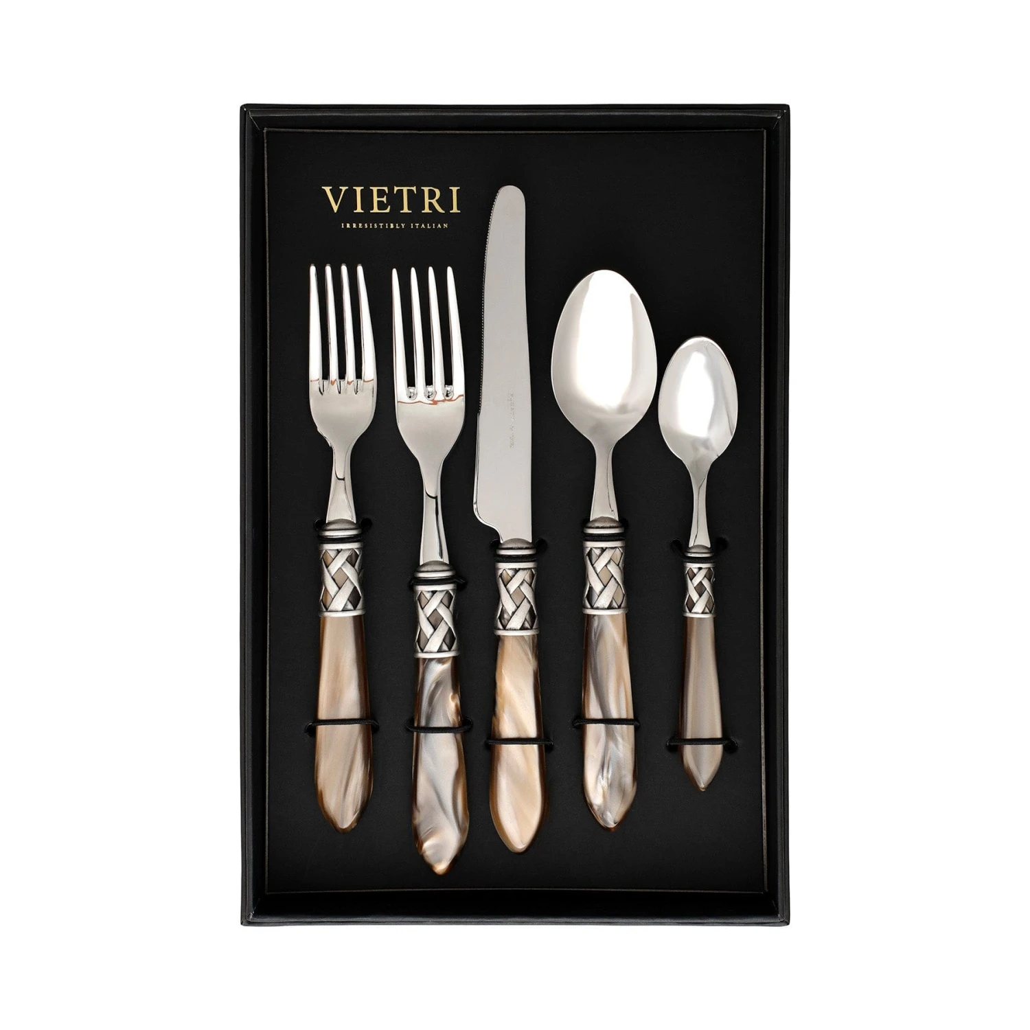 The Aladdin Antique Five-Piece Place Setting (Set of 4) features elegant pearlized handles with the strength of high-grade acrylic and 18/10 stainless steel. The handles are wrapped with intricate lattice metalwork.