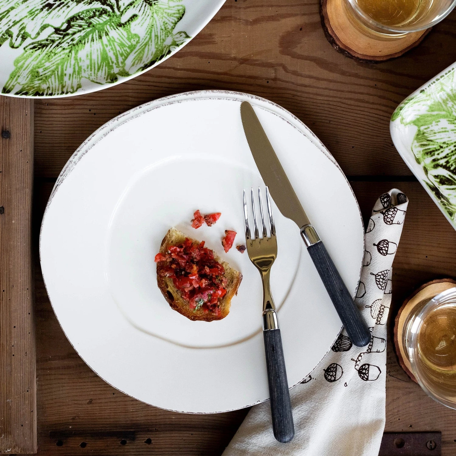 The Albero Place Knife in muted black features warm wood handles, with the strength of high-grade polyester and 18/10 stainless steel.