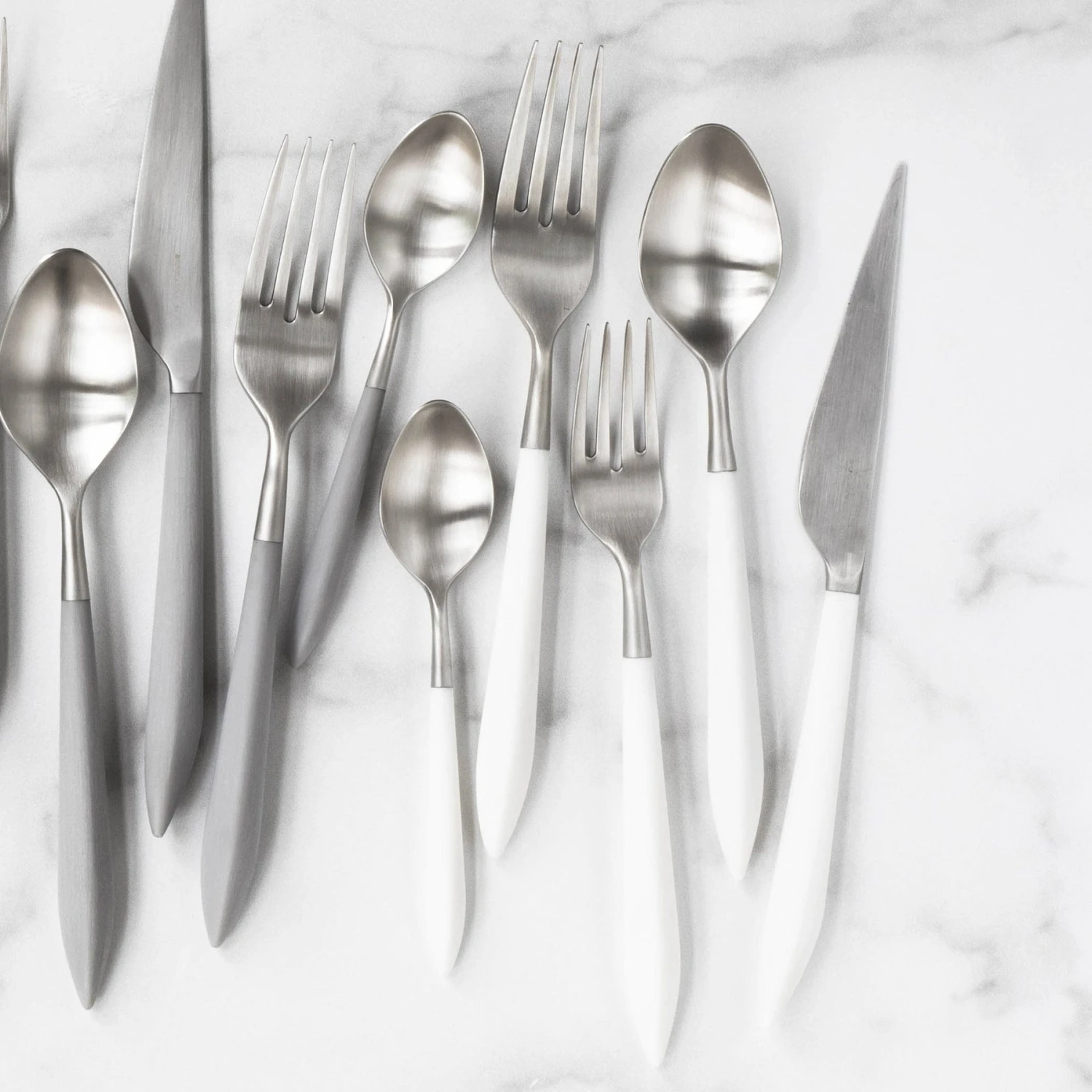 The contemporary matte handle found on the Ares Argento & White Five-Piece Place Setting provides perfect balance and weight for a luxury flatware experience. Argento, the brushed silver, finishes off the utensil in 18/10 stainless steel.
