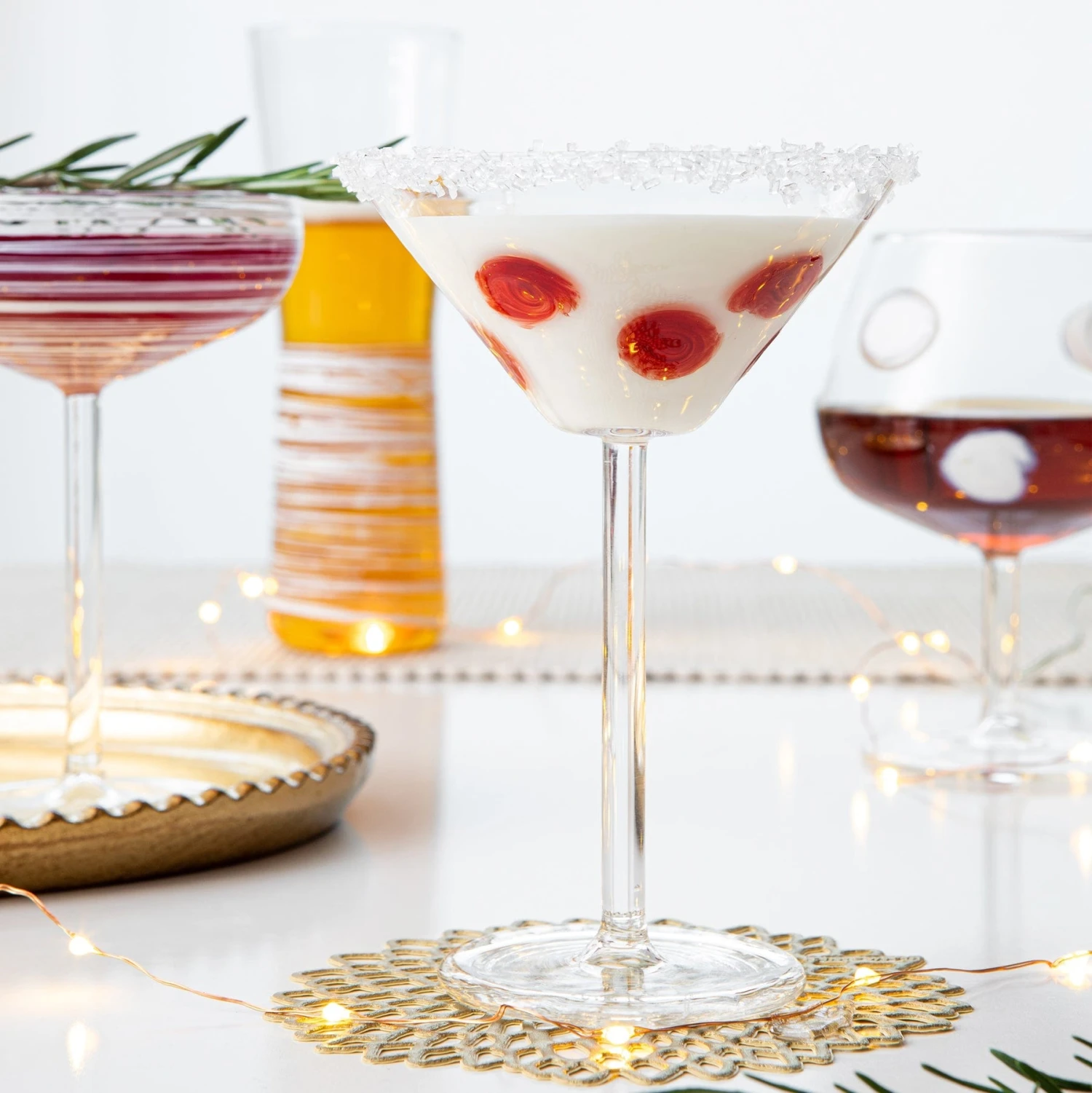 Dress up your cocktail in the Drop Martini Glass. Intricately mouthblown in Veneto, this beautiful collection brings a playful, chic touch to your favorite barware assortment.