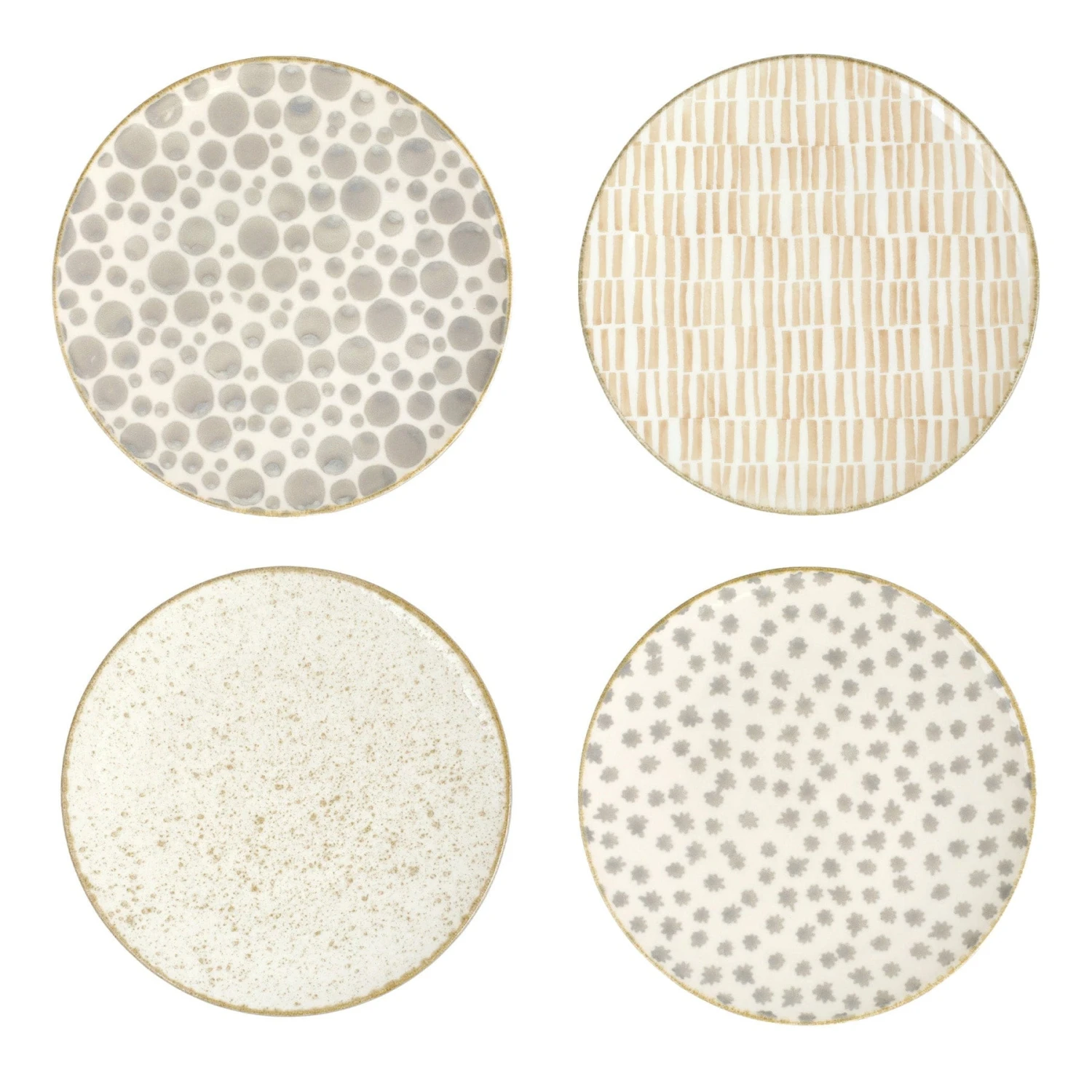 The Earth Assorted Dinner Plates combine mid-century neutral tones with simple silhouettes in four versatile handpainted patterns.