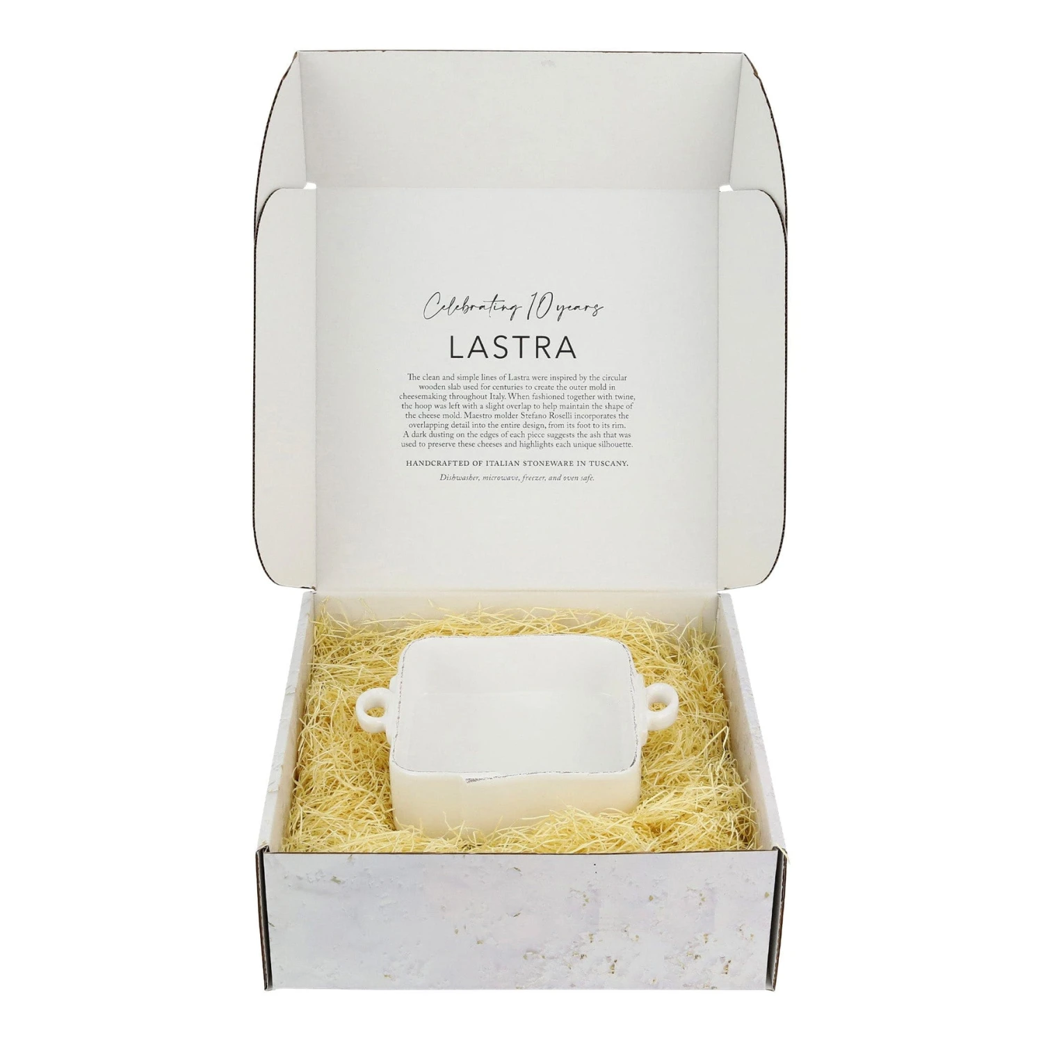Beloved for its sophisticated simplicity, versatility, and durability, Lastra is our bestselling collection. The understated elegance, clean lines, and unique shape of the Lastra White Square Baker make it a timeless baking and serving piece. Lastra’s design was inspired by the circular wooden slabs used for centuries to create the outer mold in cheesemaking throughout Italy. When fashioned together with twine, the hoop was left with a slight overlap to help maintain the shape of the cheese mold. Maestro molder Stefano Roselli incorporates the overlapping detail into the entire design, from its foot to its rim. A dark dusting on the edges of each piece suggests the ash that was used to preserve these cheeses and highlights each unique silhouette. This timeless piece comes packaged in a limited edition celebration box in honor of Lastra’s 10th Anniversary.