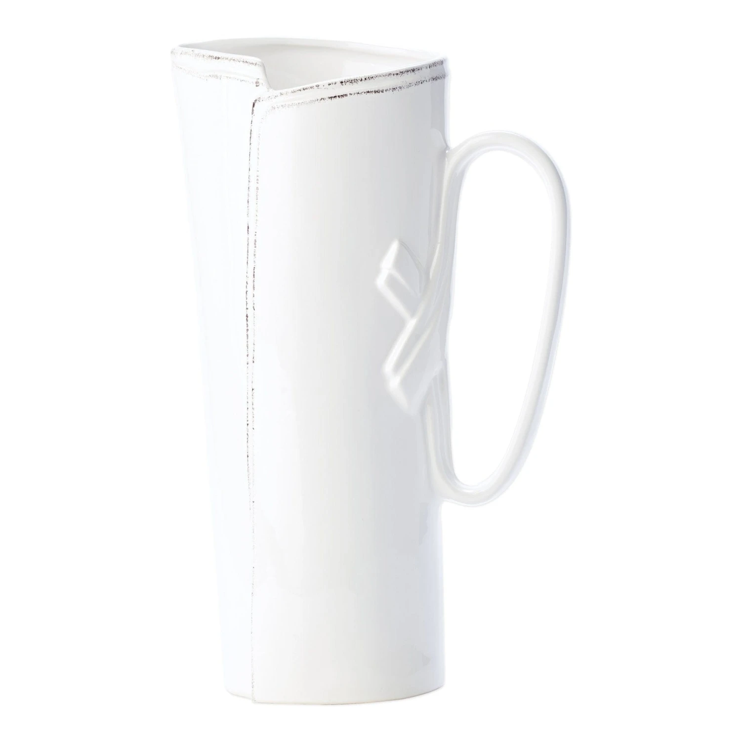Beloved for its sophisticated simplicity, versatility, and durability, Lastra is our bestselling collection. The understated elegance, clean lines, and unique shape of the Lastra White Tavern Pitcher make it a timeless piece for your home. We like it both for serving drinks and for displaying fresh flowers. Lastra’s design was inspired by the circular wooden slabs used for centuries to create the outer mold in cheesemaking throughout Italy. When fashioned together with twine, the hoop was left with a slight overlap to help maintain the shape of the cheese mold. Maestro molder Stefano Roselli incorporates the overlapping detail into the entire design, from its foot to its rim. A dark dusting on the edges of each piece suggests the ash that was used to preserve these cheeses and highlights each unique silhouette.