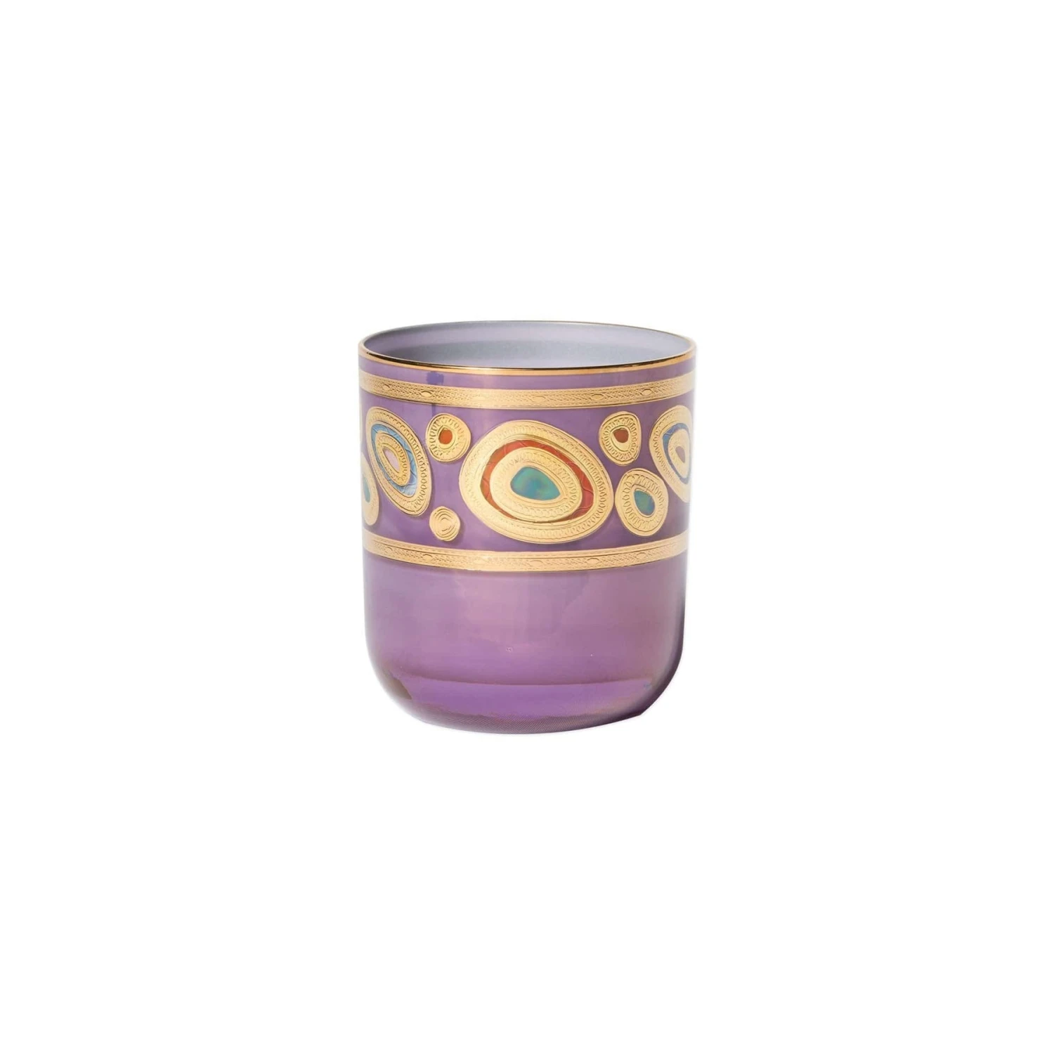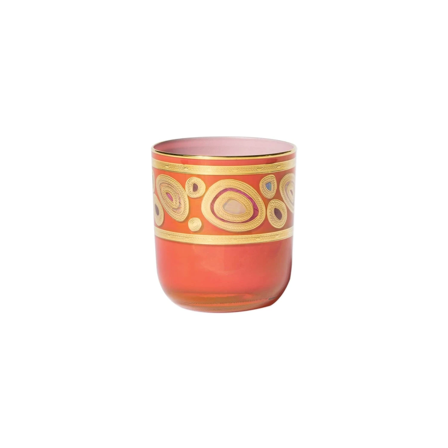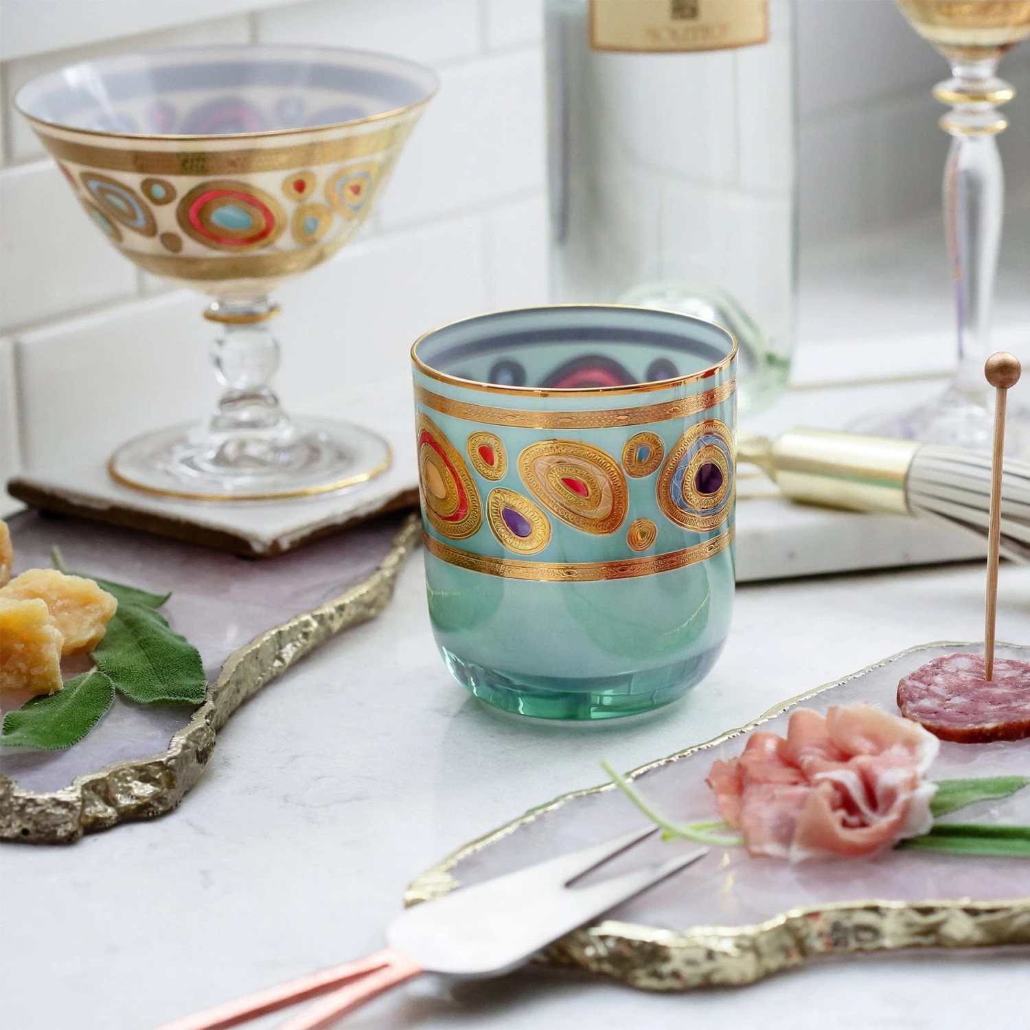 Our Regalia collection was inspired by the ornate emblems and decorations that are indicative of royalty. The Regalia Cream Double Old Fashioned is handpainted in 14-karat gold.