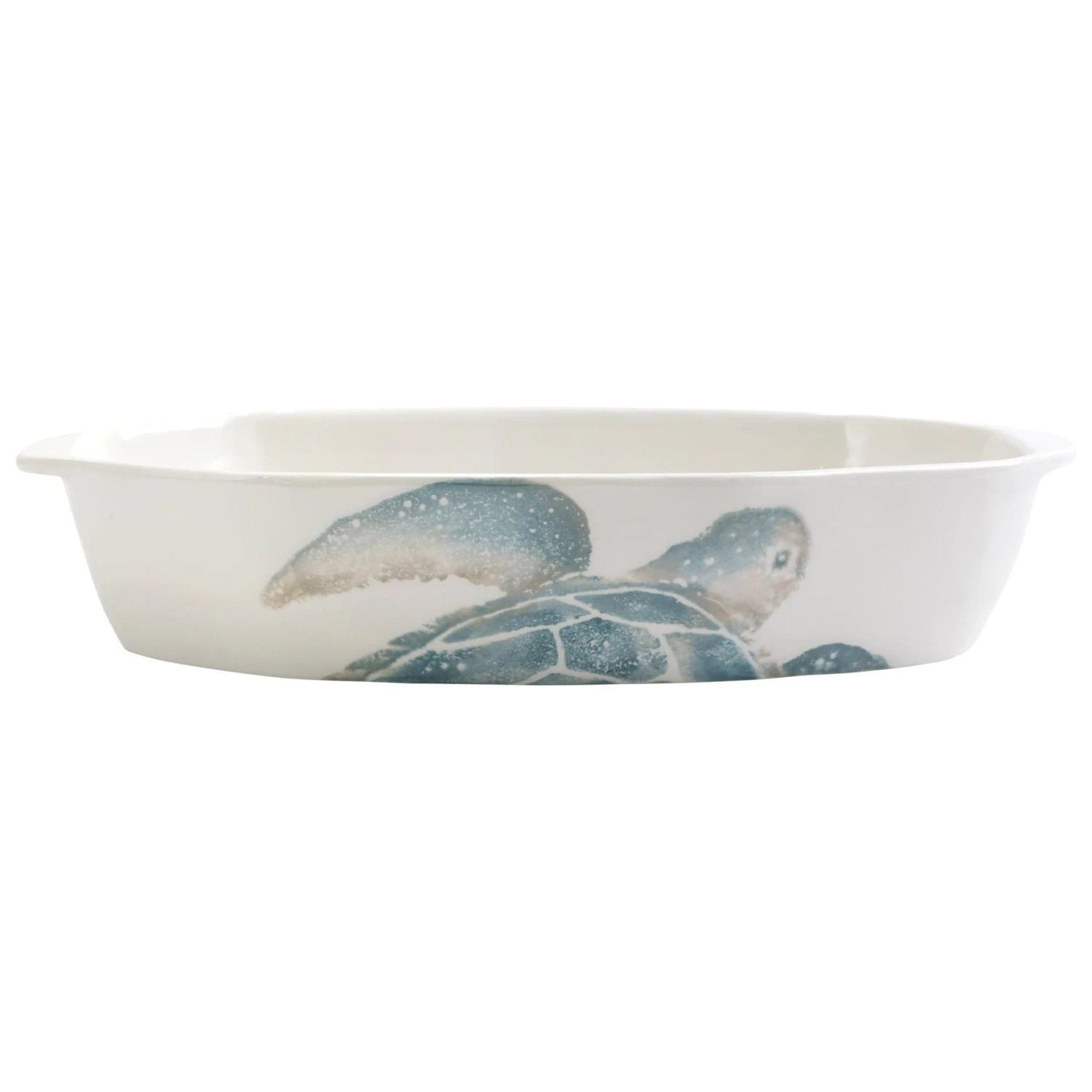 The handpainted sea turtle is rendered in hues of aqua and taupe against a clean, white canvas on the Tartaruga Rectangular Baker. Maestro artisan, Gianluca Fabbro, utilizes a unique sponging technique to carefully add detail to each piece.