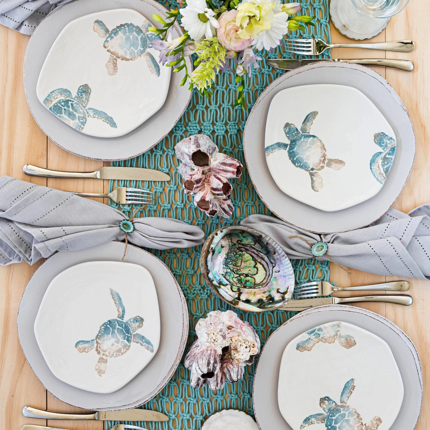 The handpainted sea turtle is rendered in hues of aqua and taupe against a clean, white canvas on the Tartaruga Turtle w/ Tail Salad Plate. Maestro artisan, Gianluca Fabbro, utilizes a unique sponging technique to carefully add detail to each piece.